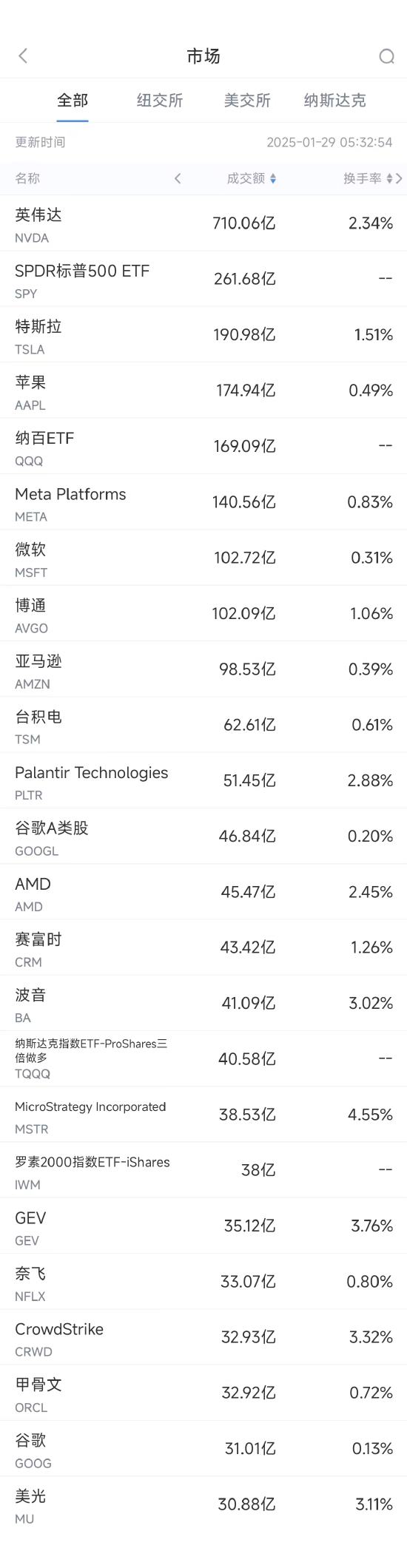 第8名臺(tái)積電收高5.25%,成交62.61億美元。受到DeepSeek引發(fā)的AI概念股下挫影響,該股周一收盤重挫13.33%。