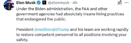 馬斯克評(píng)論美國(guó)24年來(lái)最嚴(yán)重空難,稱(chēng)DEI政策危及公眾利益