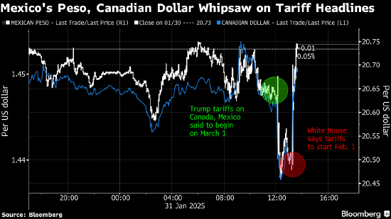 彭博美元指數(shù)一度上漲0.4%,至盤中高點(diǎn),扭轉(zhuǎn)跌勢(shì)。此前,有報(bào)道稱關(guān)稅將推遲一個(gè)月,導(dǎo)致美元下跌。白宮否認(rèn)了這一報(bào)道,表示將推進(jìn)對(duì)墨西哥和加拿大25%的關(guān)稅。