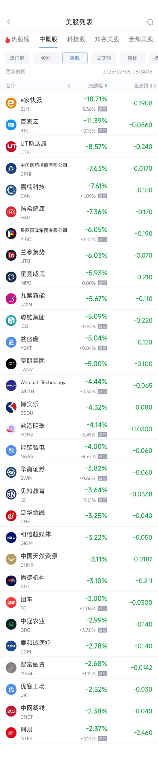 領(lǐng)跌中概股列表:
