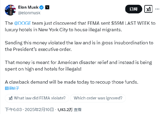 北京時間2月10日晚,馬斯克在X發(fā)文稱,美國“ *** 效率部”(DOGE)發(fā)現(xiàn),聯(lián)邦緊急事務(wù)管理署(FEMA)上周向紐約市的豪華酒店撥款5900萬美元,用于安置非法移民,這筆錢違反了法律、嚴(yán)重違反了總統(tǒng)的行政命令。