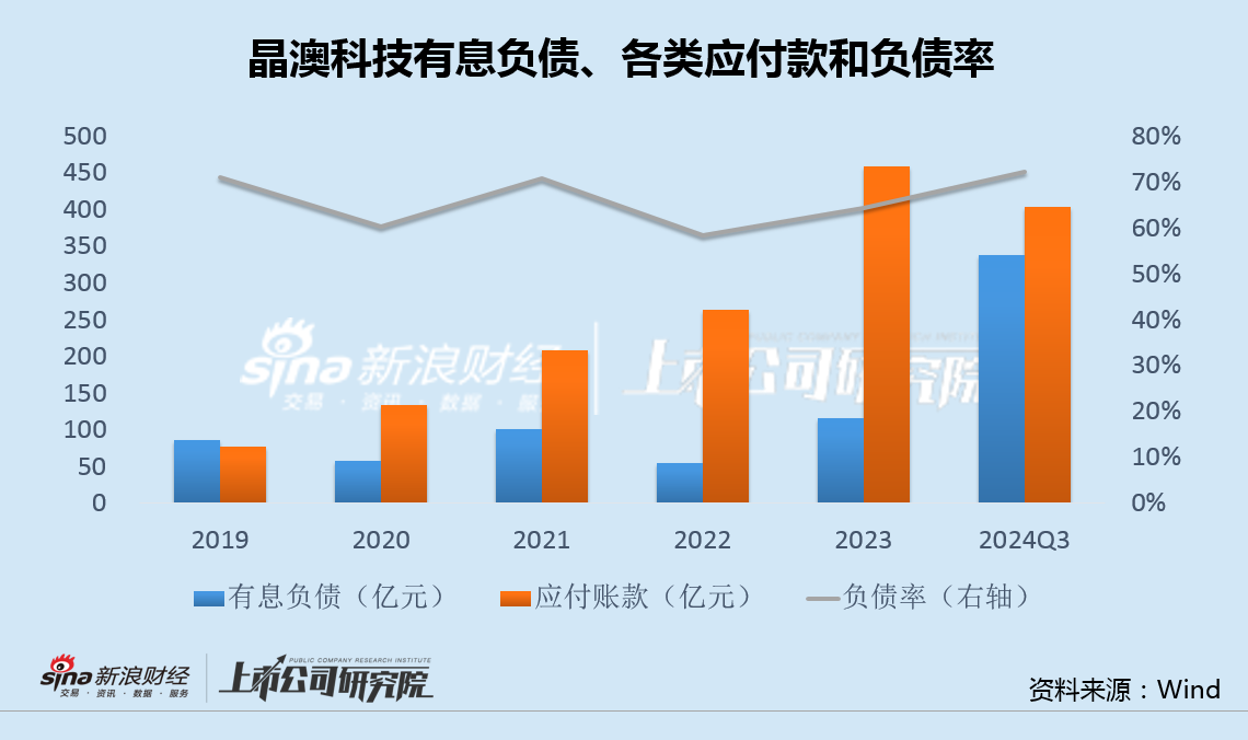 統(tǒng)計(jì)顯示,截至2024年三季度末,晶澳科技晶澳科技有息負(fù)債合計(jì)約338億,其中短期借款100.13億元,同比增長(zhǎng)1387.46%,長(zhǎng)期借款136.41億元,同比增長(zhǎng)796.58%,各類應(yīng)付款合計(jì)約404億,期末公司總負(fù)債839.03億元,負(fù)債率達(dá)72.15%,創(chuàng)下2010年以來新高。