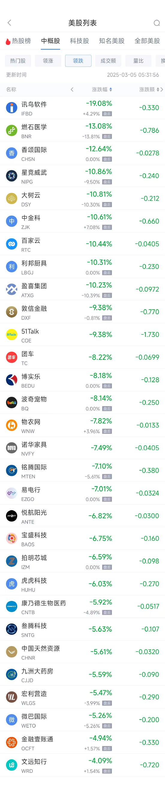 領(lǐng)跌中概股列表: