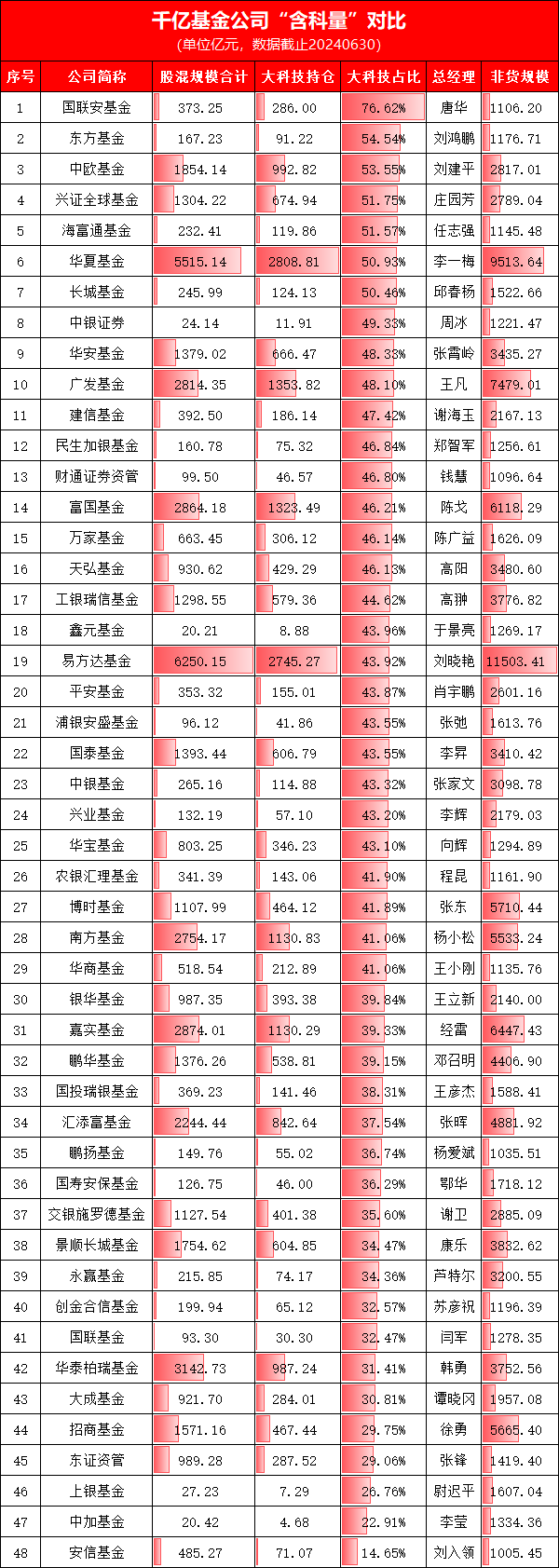 根據(jù)Wind數(shù)據(jù),截至2024年6月30日,全市場非貨規(guī)模超千億的基金公司共48家,其“含科量”分化顯著。國聯(lián)安基金以76.6%的“含科量”居首,緊隨其后的東方基金、中歐基金占比均超50%。而安信基金以14.6%的含科量墊底,招商基金則以29.75%位列倒數(shù)第五,引發(fā)市場對其科技布局策略的討論。