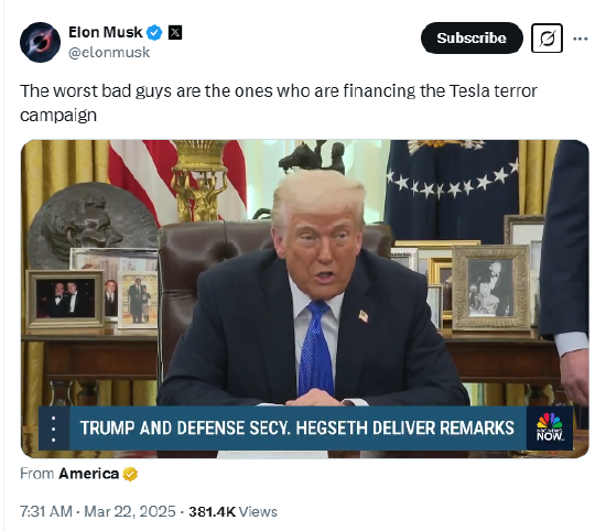 近日,美國發(fā)生了多起針對特斯拉電動車及其相關(guān)設(shè)施的縱火事件。特朗普表示,“那些被抓到破壞特斯拉的人,將有很大可能被判入獄長達(dá)20年,這包括資助者。我們正在尋找你?!瘪R斯克在X平臺轉(zhuǎn)發(fā)特朗普言論報道,并配文“資助特斯拉襲擊行動的人是最壞的壞人”。
