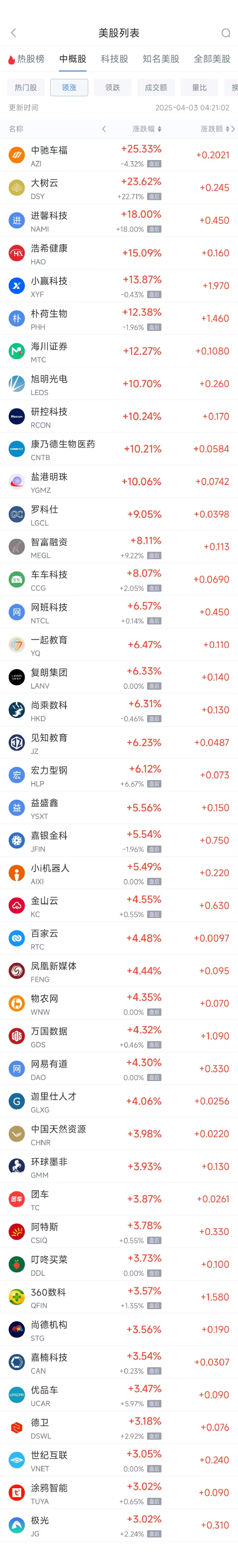 領(lǐng)漲中概股列表: