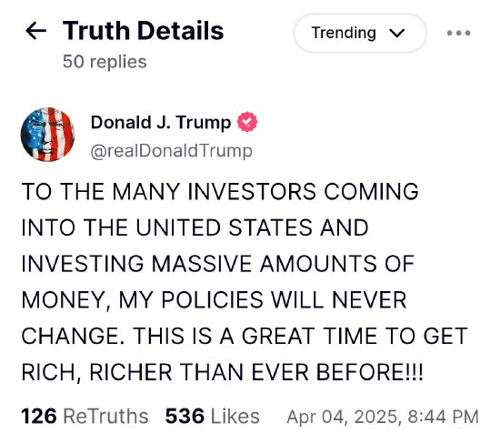 美國總統(tǒng)特朗普在社交媒體發(fā)帖稱,對于許多進(jìn)入美國并投入大量資金的投資者,其政策永遠(yuǎn)不會改變。這是一個致富的好時機,將比以往任何時候都要富有。